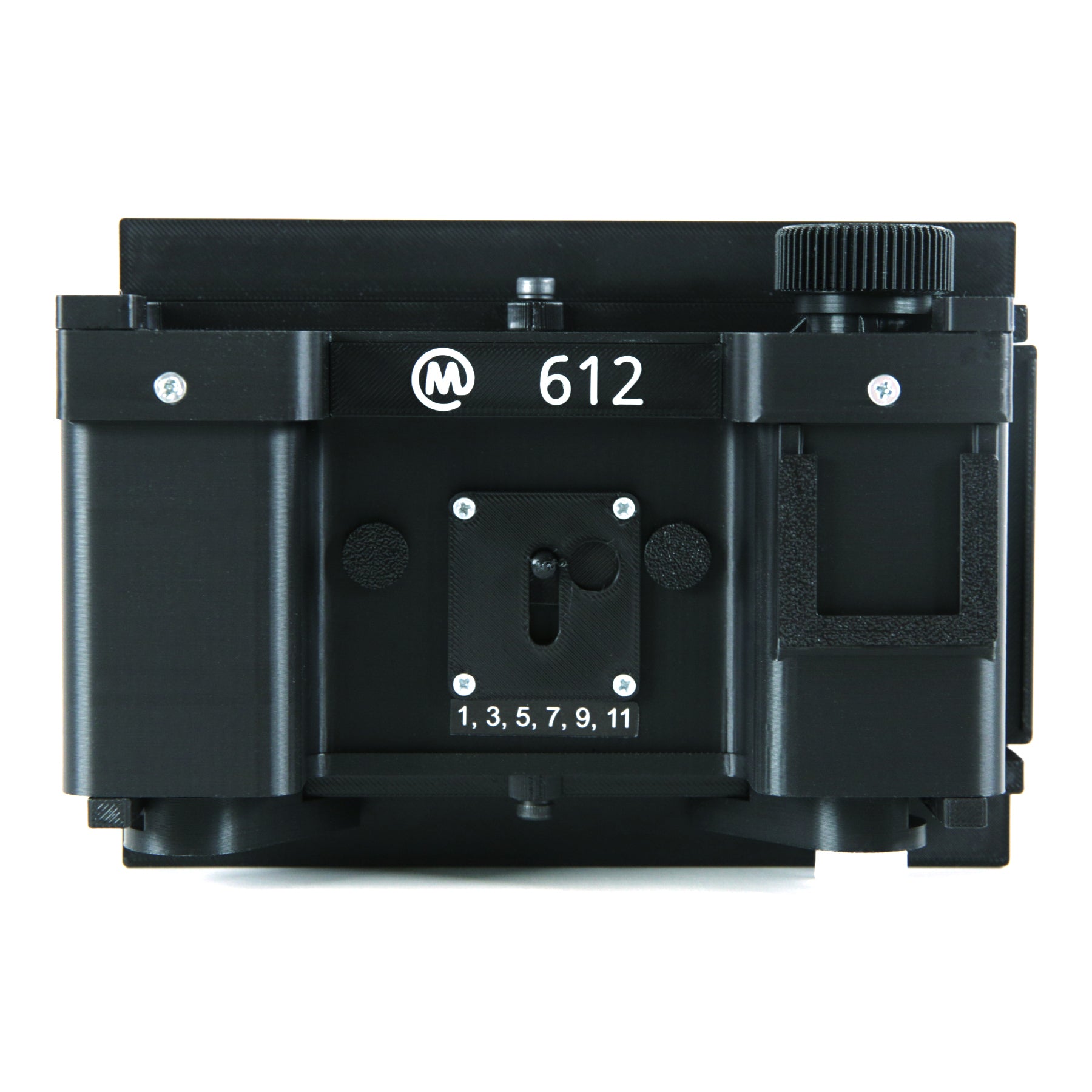 It features a robust design, smooth film transport, a metal darkslide, and a larger-than-standard 117mm wide frame. This is larger than any of the standard metal backs. We've found this to be the optimal width for medium format stereo photography, enabling 50mm wide mounted slides, while still providing structural stability.