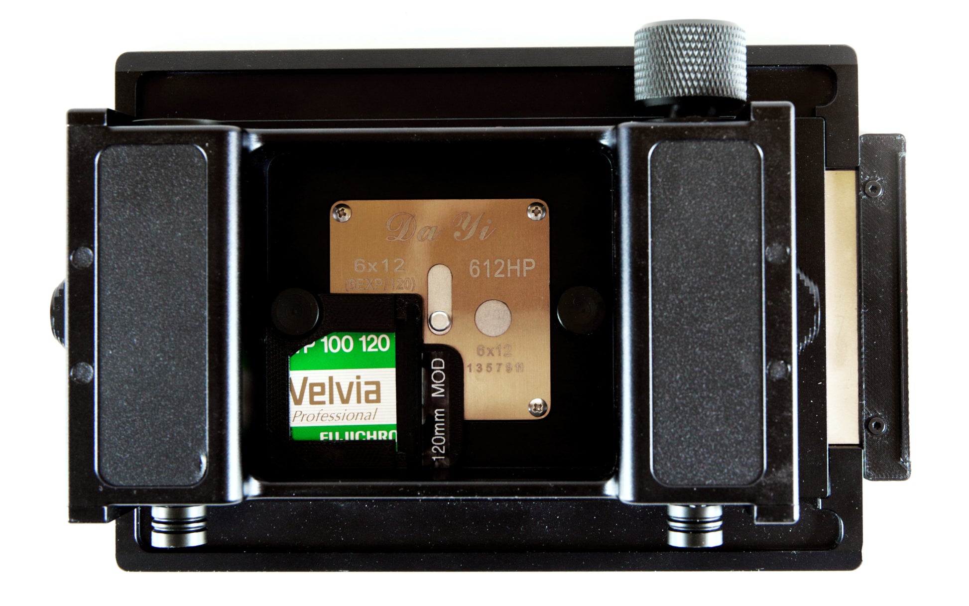 This service upgrades your existing Da Yi 120 film back to reduce film pinching, enlarge the exposure aperture to 56mm x 120mm, construct a new metal darkslide with better light blocking ability, masking the extraneous (non-panoramic) film window and text, and add a 120 film box end holder to indicate what type of film is loaded.