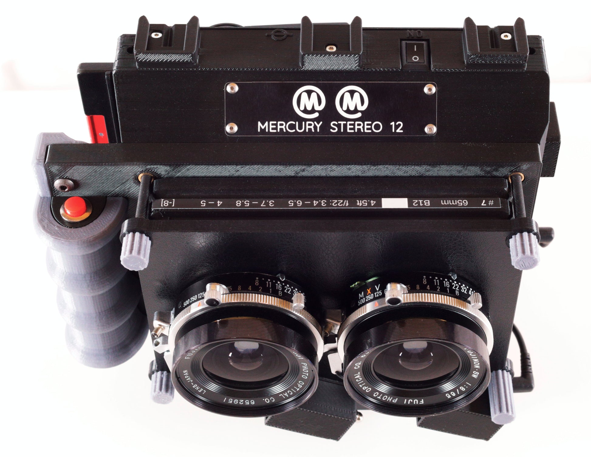 The Mercury Stereo 12 is a Stereoscopic (3D) camera that shoots 120, 70mm, large format, and 65mm IMAX film. It is fully modular and accepts many different lenses. It uses a fully-electronic triggering system for near-perfect sync between lenses. This is the most advanced camera ever invented by Mercury Works, and the most versatile 3D camera in the history of photography.