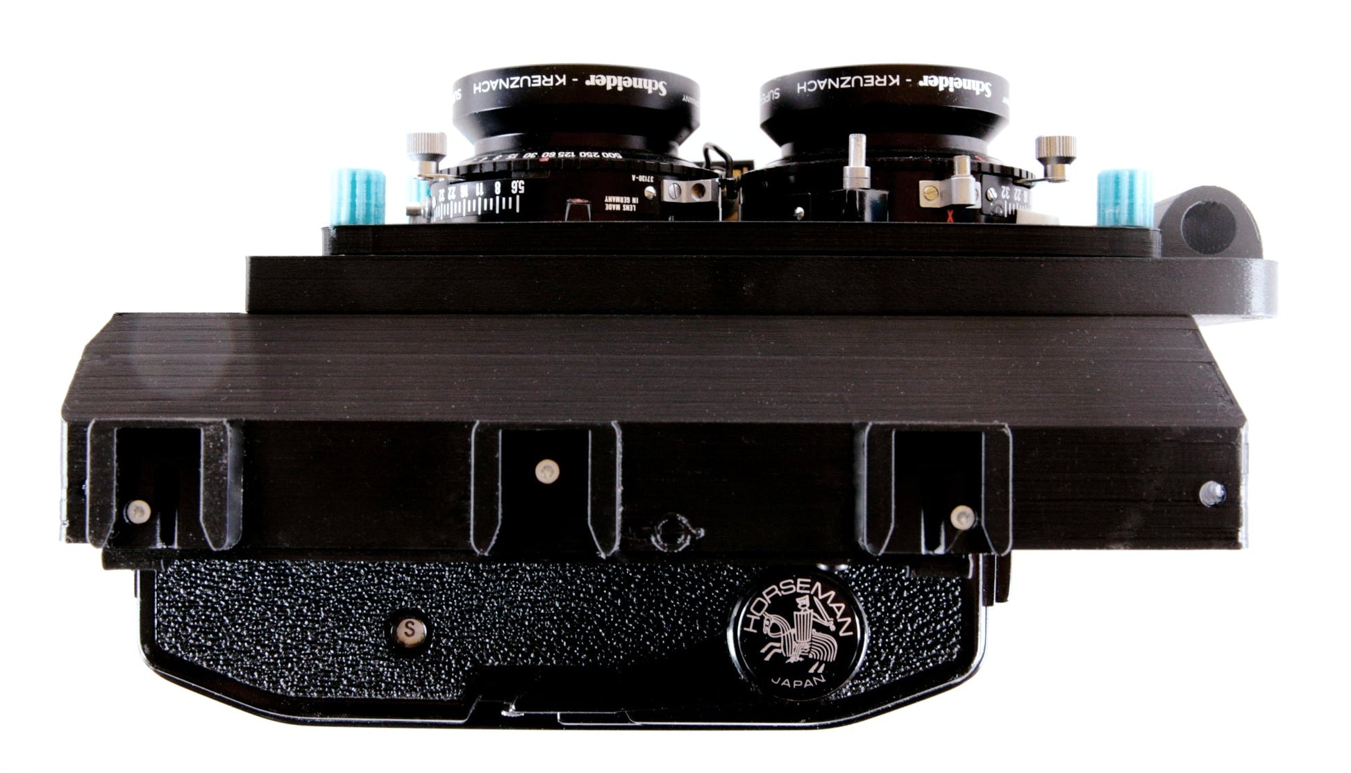 This large format camera body accepts all Stereo 12 and Stereo M lensboards, front spacers, quick-release side handles, and film backs. It is a quick and easy way to use your Stereo camera kit to shoot large format, especially panoramas with 120 and 70mm panoramic backs (but also 4x5 sheet film).