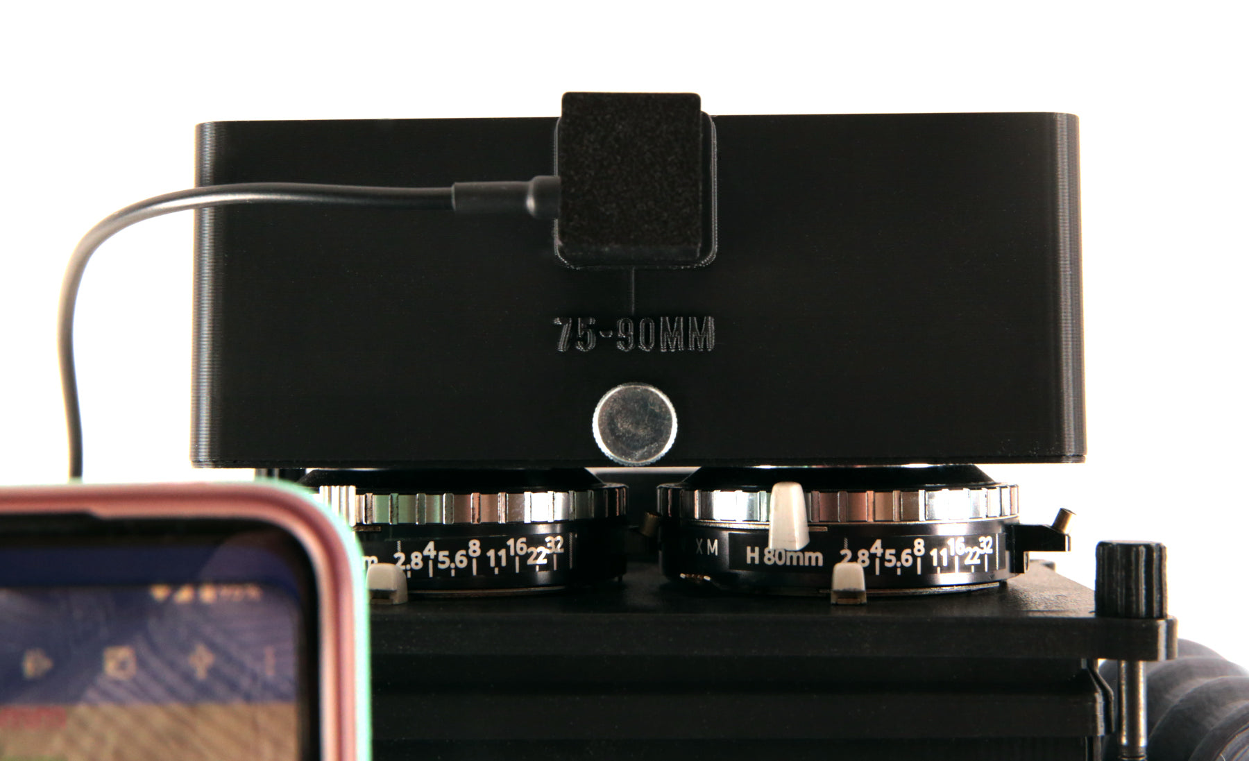 This comes with printable framing templates that will be emailed to you. They cover several common phone sizes, but you can also resize the PDF to fit any phone. Use the template to note and mark frame borders for the lens or lenses you use. For 6x6 and MF3D use, the finder is particularly useful to wide angle lenses (55mm to 65mm). 80mm and longer work fine as well, but require some form of mask to mark the four sides of the frame, as the video feed will be larger than the frame size.